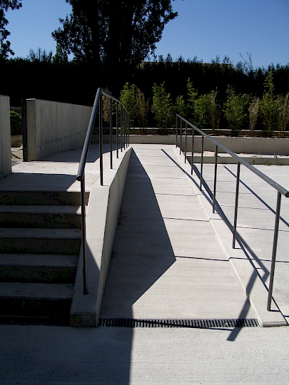 Rampe d’accès au jardin d’enfants Maison de quartier des Acacias. Déplacement de l’aire de jeux de la Maison de quartier à l’arrière de l’immeuble, à l’abri des nuisances de la route. Des bacs à sable sont dissimulés dans l’emmarchement sous les caillebotis modulaires en bois. Une fontaine a été installée contre un mur.