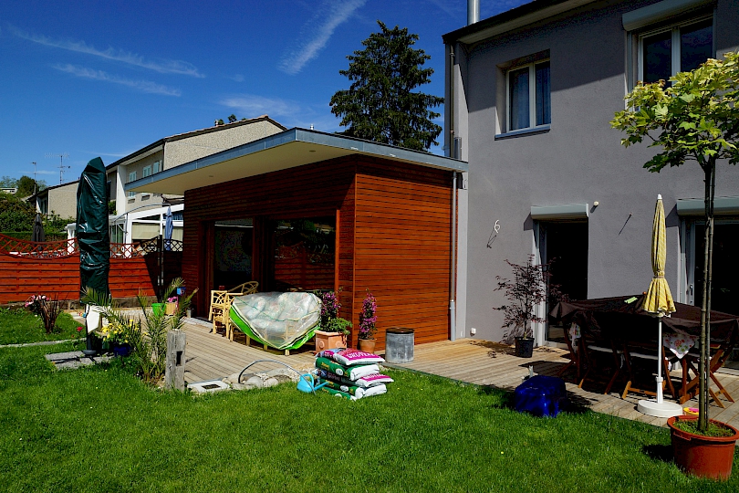 Cette maison a obtenu le label Minergie selon certificat n° GE-860. Le chauffage est assuré par une chaudière à gaz et un chauffage au sol en basse température. En complément à l’accumulateur existant pour la production d’eau chaude, des panneaux solaires thermiques et photovoltaïques recouvrent tout le pan de toiture sud-est de la maison existante. De plus, la maison est équipée d’une ventilation mécanique contrôlée avec récupérateur de chaleur. L’enveloppe est constituée d’un mur de refend en brique cellulaire, de deux façades pignons à ossature bois et bardage mélèze et, des fenêtres en mélèze avec verre isolants triples. Toute l’enveloppe, y compris la toiture, est isolée avec un épais matelas de laine de bois. Compte tenu des performances thermiques très élevées de l’enveloppe, le chauffage est assuré presque intégralement par un poêle en stéatite. Selon les occupants, le chauffage au gaz n’est utilisé que comme appoint, lors de grands froids.