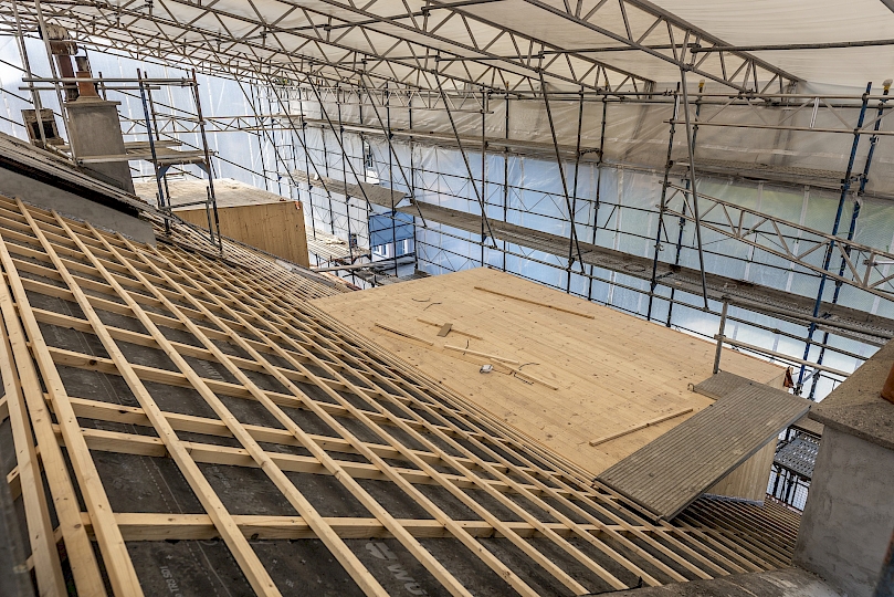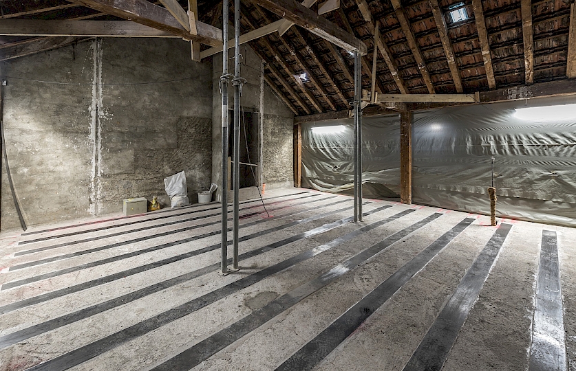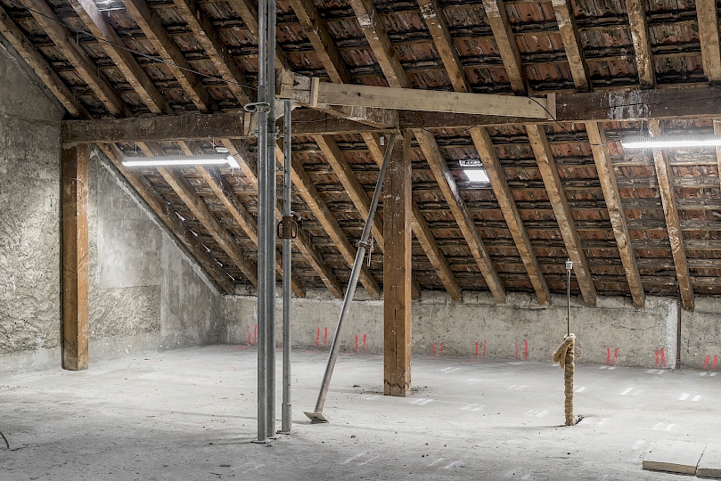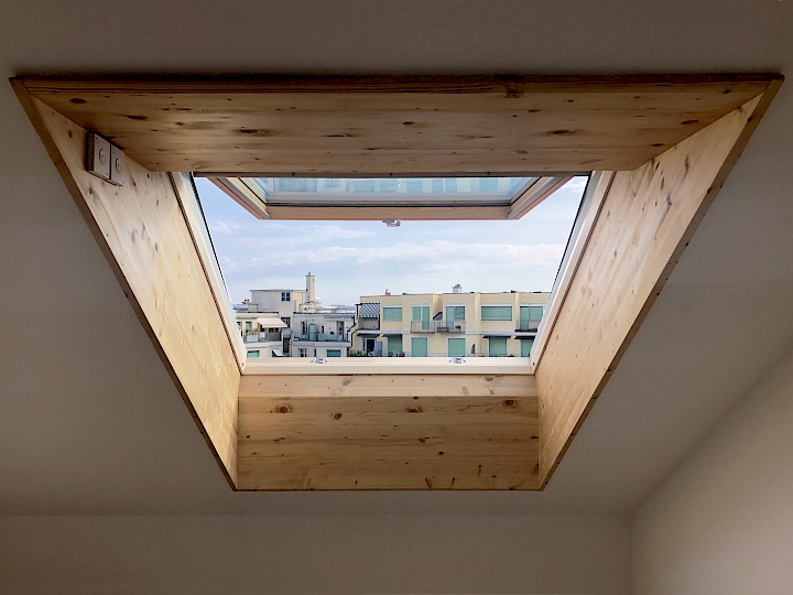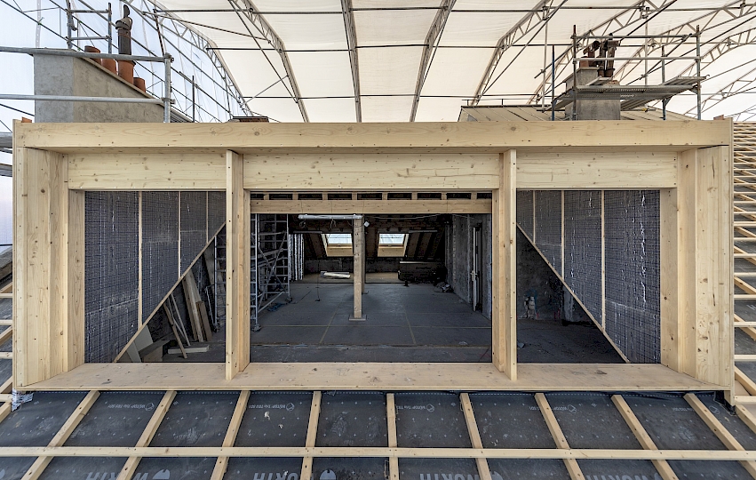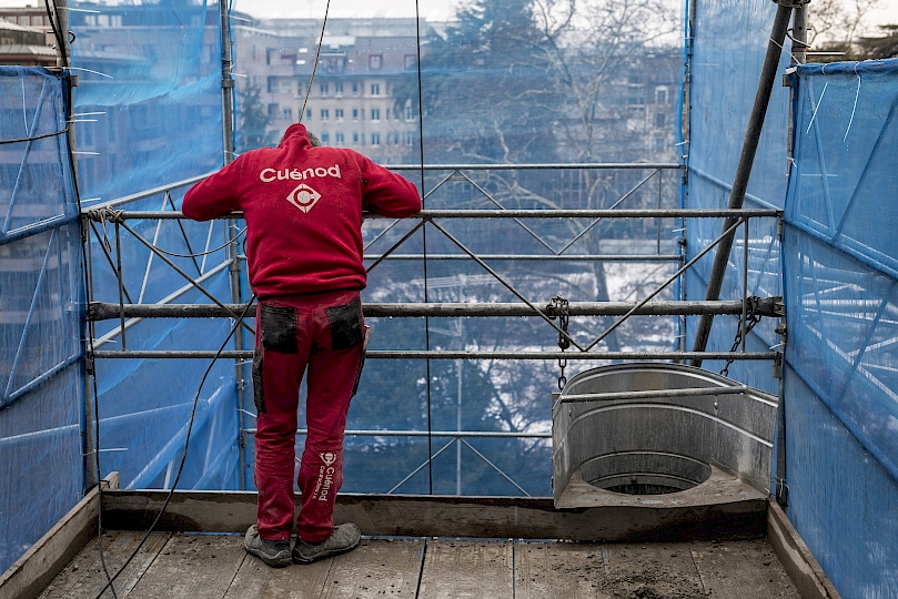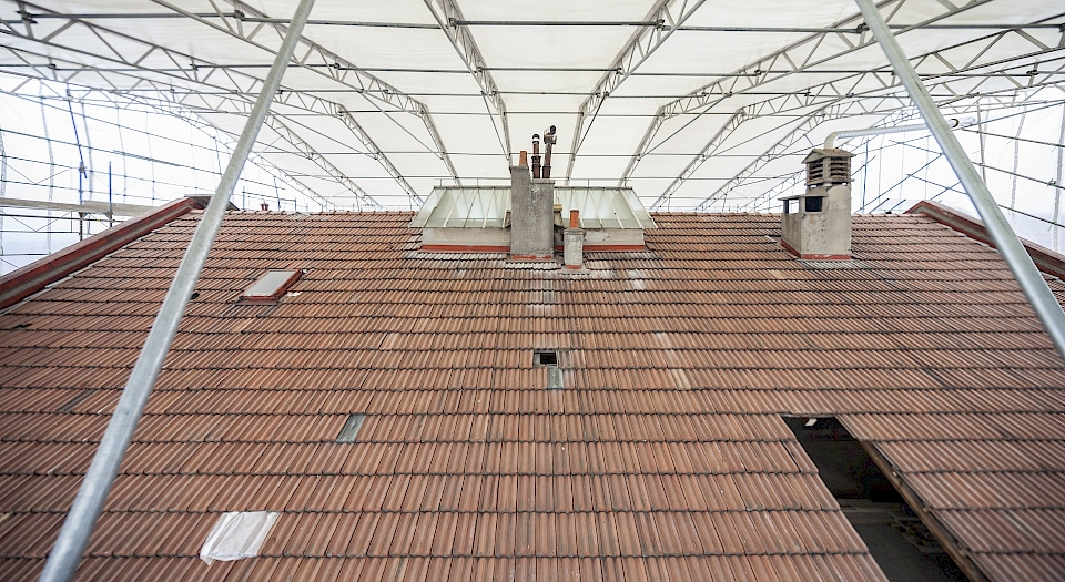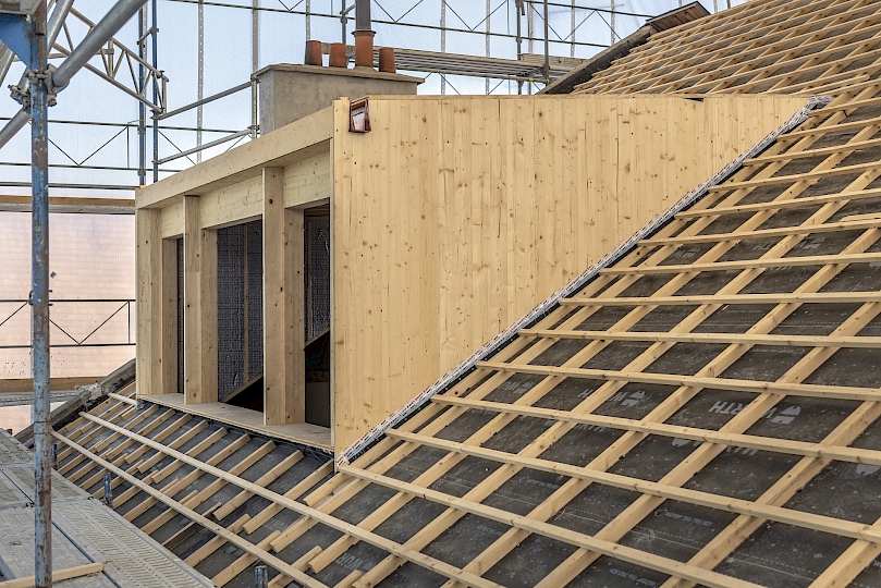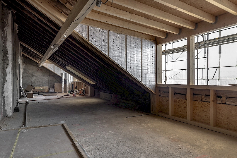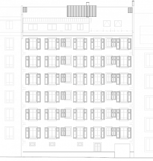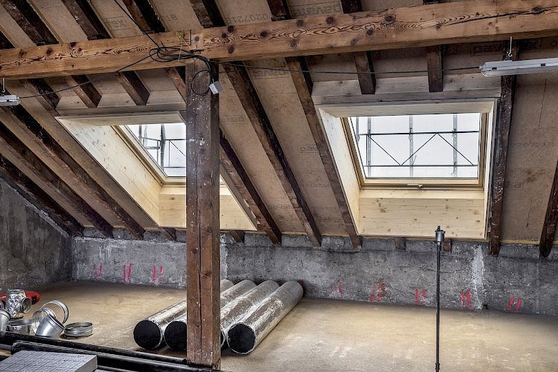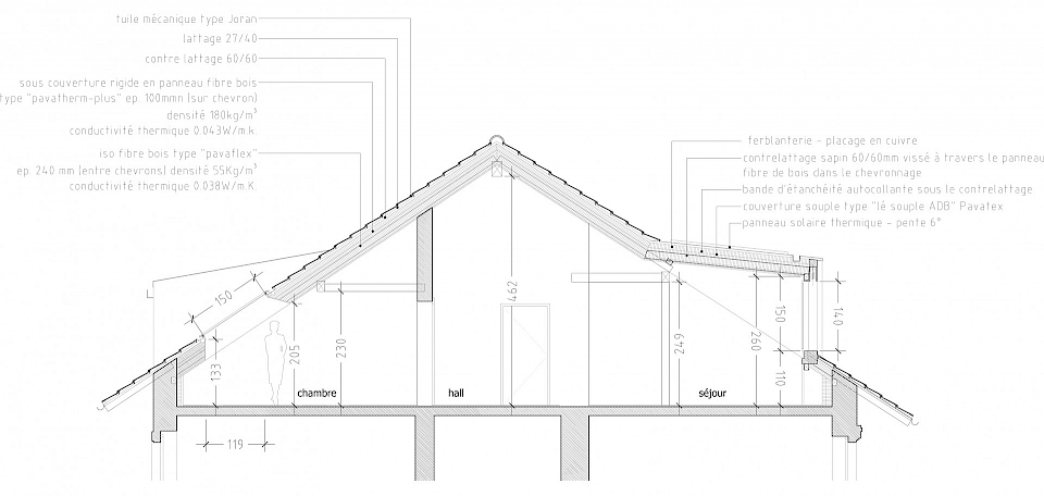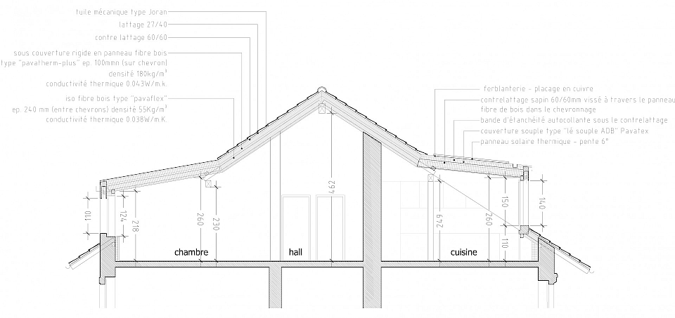 L'enveloppe thermique pour les locaux aménagés dans les combles a été conçue selon un standard de haute performance énergétique, avec des matériaux de grande qualité et répondant aux principes de mise en oeuvre dans les constructions anciennes (matériaux à haute diffusion de vapeur d'eau). Le dispositif de lucarnes est proposé selon des dimensions maximales autorisées par la nouvelle loi sur les lucarnes. En effet, la réflexion engagée sur cet édifice de 6 étages propose une "expérience pilote" afin de vérifier l'intégration au plan qualitatif et architectural d'une solution qui permettrait d'attenuer les effets négatifs induits par l'actuelle loi sur les lucarnes. Cette forme de lucarne permet d'obtenir une bonne intégration architecturale et incidemment offre la possibilité d'intégrer des panneaux solaires permettant de couvrir 30% des besoins en eau chaude sanitaire de tout l'immeuble conformément à la loi sur l'énergie. Ce concept permet également d'éviter de nombreux percements de la couverture en tuile pour les ouvertures diverses et multiples nécessaires pour éclairer les locaux et impliquant la pose de panneaux solaires en rive de toiture ou en dessous du faîte.