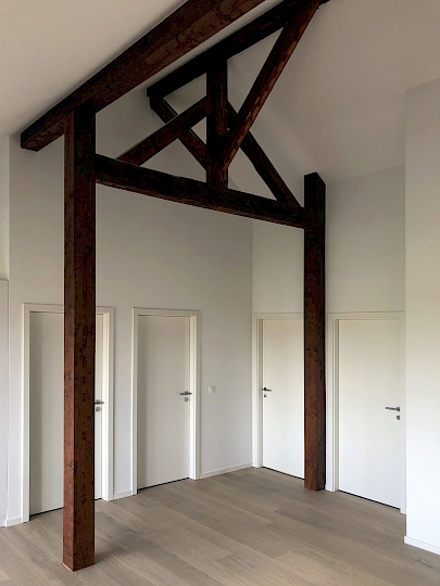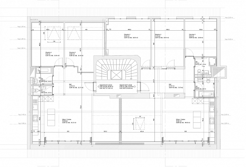 Ce projet consiste en la réalisation de deux logements traversants de 4 et 5 pièces dans les combles au 7ème étage d'un bâtiment construit en 1923 par les architectes Boissonnas et Henssler. Les deux appartements proposent un hall d'entrée généreux qui dessert toutes les pièces. Les chambres sont orientées au nord-est, côté cour. Les espaces de séjour sont eux orientés au sud-ouest, côté Rue de Beaumont.