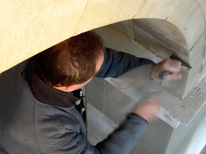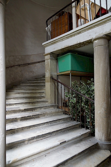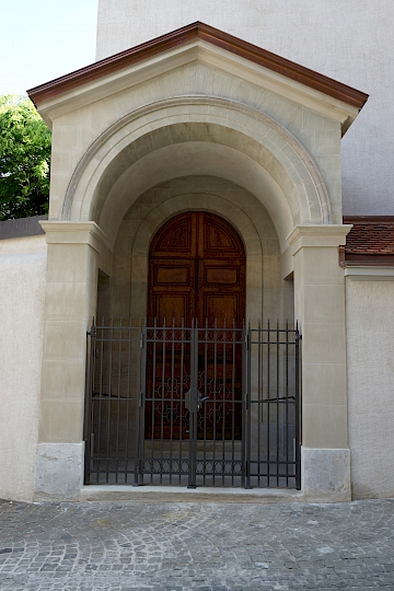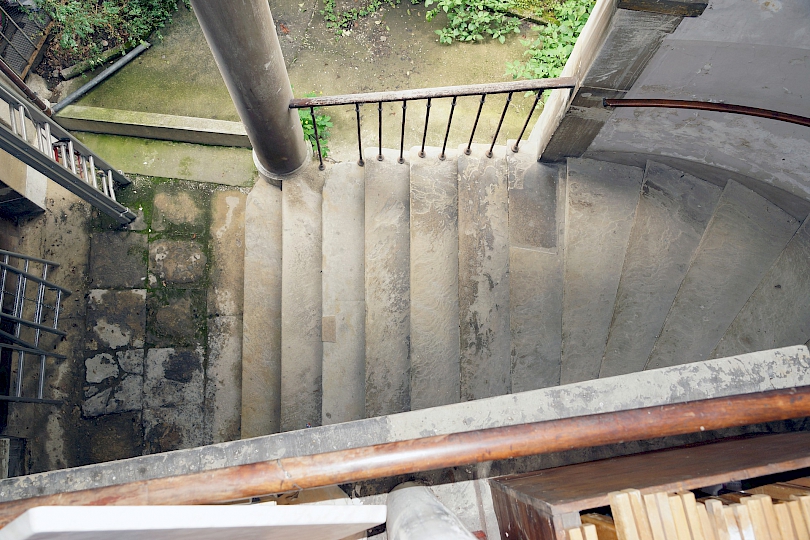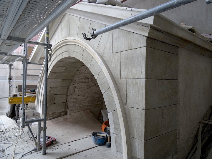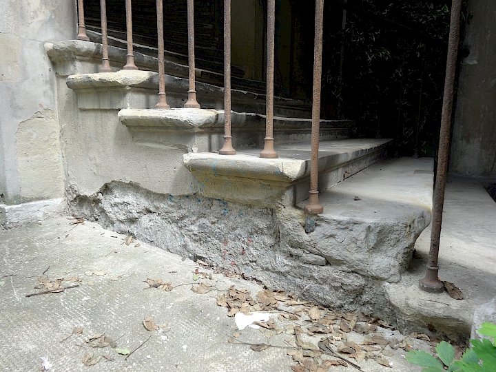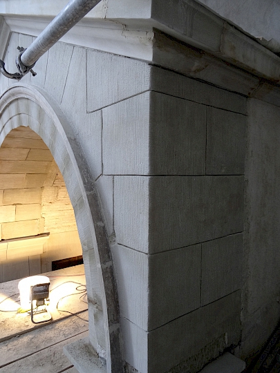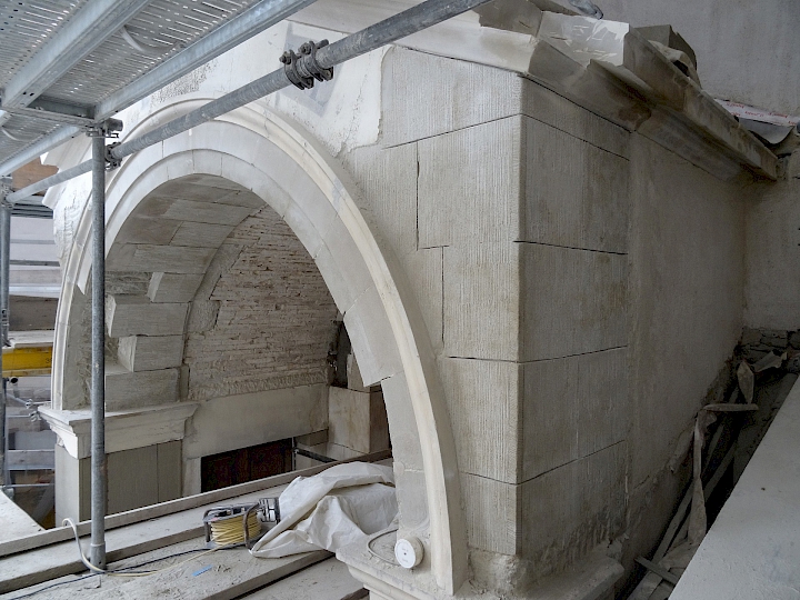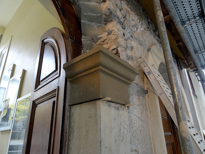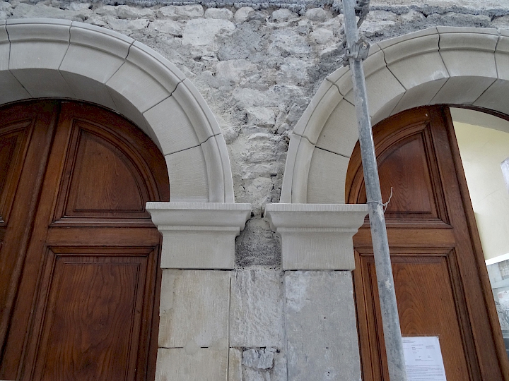 - Fin du XIXème siècle : première restauration par l’architecte Antony Krafft. Remplacements des colonnes inférieures en bois en colonnes de pierre provenant de Soleure (pour des raisons de statistique).