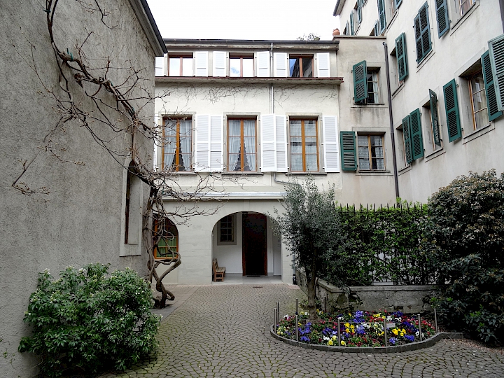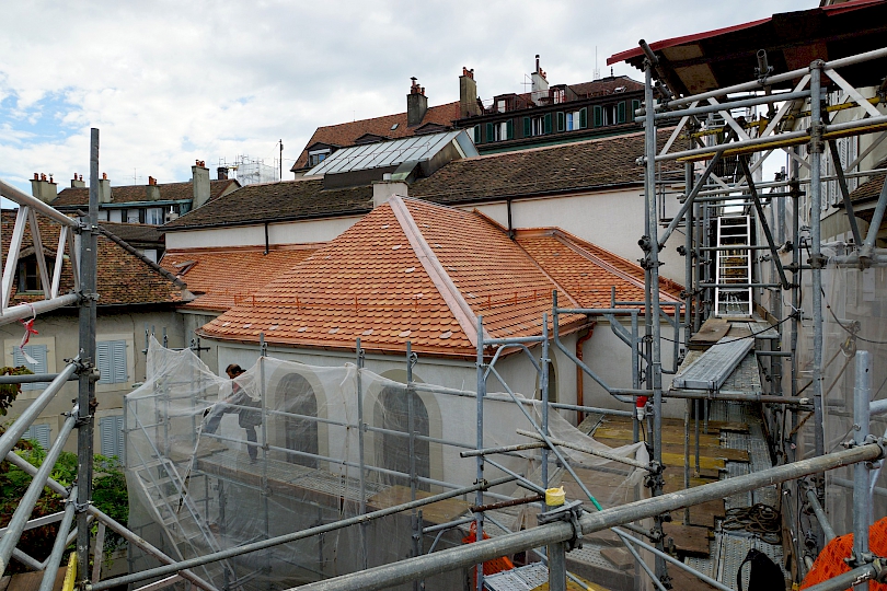 - 1934-1930 : Restauration considérable par l’architecte Edmond Fatio (1871-1959), travaux d’hygiène et d’aération, reprise complète du plafond de la grande voûte et restauration des immeubles sur cour.