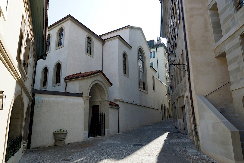Edifiée en 1833-1834 par l’architecte français, Jacques Louis Brocher pour la Société Évangélique, aujourd’hui Église Évangélique Libre de Genève. Situé dans la zone protégée de la vieille-ville de Genève, l’édifice est construit sur un plan basilical, tronqué sur la façade ouest, laquelle suit l’irrégularité de la parcelle.