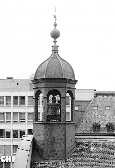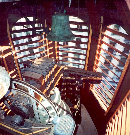 La grosse cloche, coulée par Jean Du Villard en 1607, se trouvait à l'origine dans tour de l'horloge du Molard et fut transférée à la Fusterie en 1763. Son diamètre est de 111 cm. En arrière plan, on distingue la cloche moyenne, coulée par les frères Michel et Alexis Joly & Etienne de la Paix en 1678. Elle provient peut-être de l'arsenal. Son diamètre est de 55 cm. Sur la vue 38, on distingue en arrière plan, la petite cloche coulée en 1699, son auteur n'est pas identifié, selon l'inventaire de A. Cahorn, il s'agit peut-être de Jean Revillard. Son diamètre est de 46 cm. Ces trois cloches ont simplement été brossées à l'eau afin de ne pas endommager la surface.