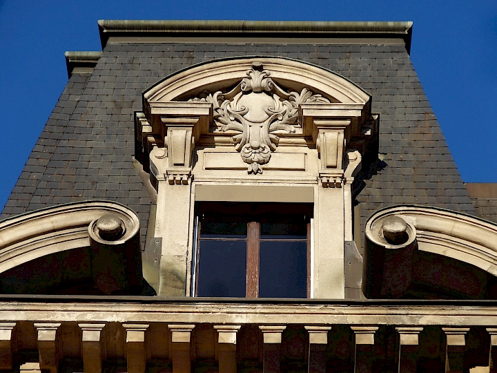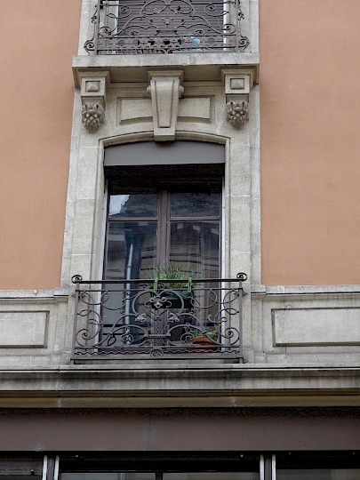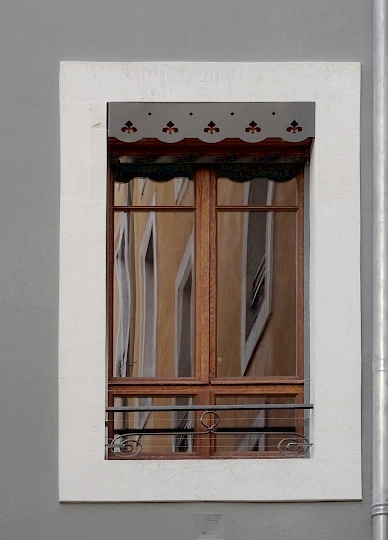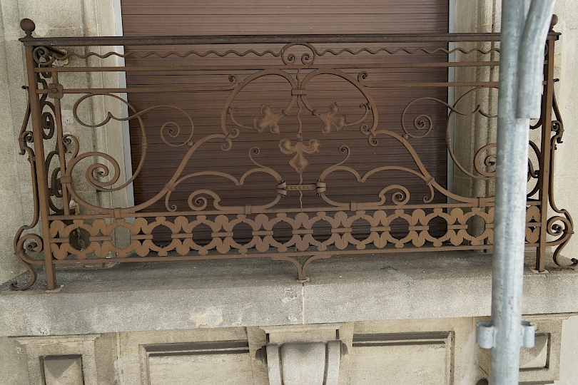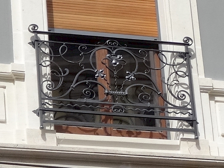 Les lambrequins existants étaient droits, brun foncé. Nous les avons remplacés par des lambrequins de forme identique à l'existant (droit ou arrondi), thermolaqués NCS S 7000-N, la même teinte que les coulisses et lames finales de stores. Nous avons ajouté des décors, dont la forme en fleur de lys provient d'un dessin présent sur les garde-corps.