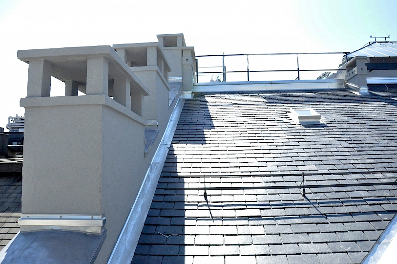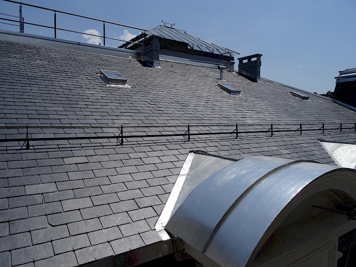 La couverture en écaille de fibro-ciment, type eternit, avec présence d'amiante, a été déposée sur les brisis et la toiture supérieure. De même que les écailles d'ardoise d'Angers présentes sur la tour d'angle, trop endommagées pour une récupération. La sous-couverture (type Tyveck X3), le contre-lattage et le lattage ont été remplacés. Les brisis, toiture et tour d'angle ont été recouverts d'ardoises naturelles espagnoles, type Galiza Star. Dimensions 40.5 x 25cm, carrées, grises. Barres à neige à l'ancienne, type "Genevoises". Crochets de service type "SDH" en acier inox, avec oeillet d'arrimage pour protection individuelle, conforme aux normes. Les tabatières ont été remplacés par des châssis isolés, dimensions 40x60cm.