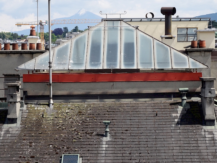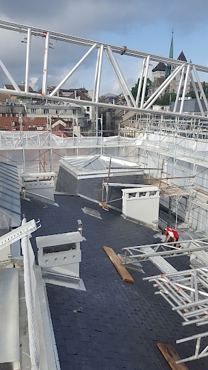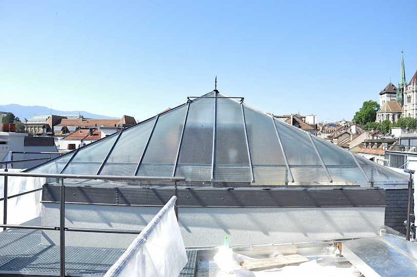 Les anciens verres, fissurés poru certains, ont été déposés, les joints amiantés ont été assainis. La structure métallique a été brossée et traitée contre la rouille. Elle a été repeinte en peinture micasée, teinte ML-E7, de même que la ferblanterie périphérique. De nouveaux verres armés, type O, ont été posés avec un joint silicone Gyso, teinte anthracite. Le passage entre les deux terrassons s'effectue par une passerelle caillebotis de 80cm de large. Des barrières de protection ont été installées sur tout le pourtour des terrassons.