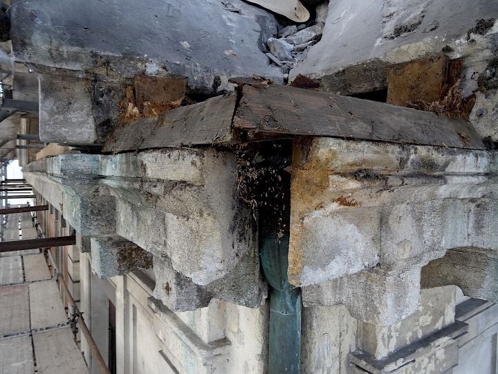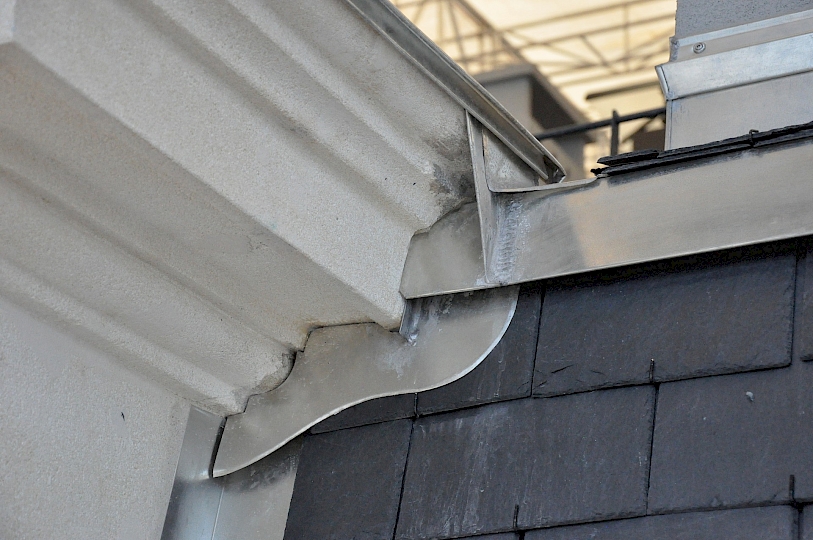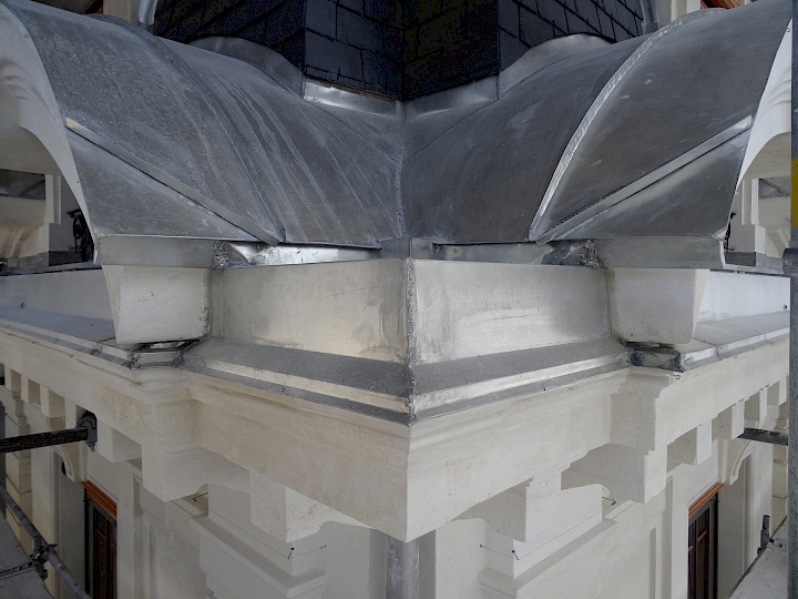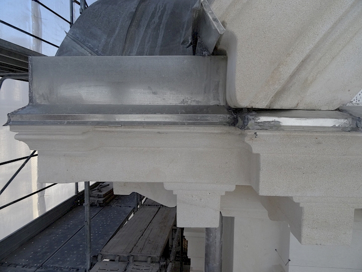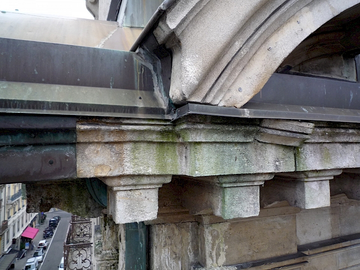 La ferblanterie en cuivre, oxydée, a été remplacée par du cuivre étamé. Tous les raccords avec la pierre ont été optimisés. Nous avons réalisé des césures dans la pierre afin d'insérer les ferblanteries. Après fixation du cuivre étamé, le tailleur a fermé les césures avec un joint à base de mortier de chaux adapté avec un concassé de pierre. Cette finition permet un détail plus abouti et une meilleure étanchéité. Le chéneau, marqué par de nombreuses infiltrations, a été redessiné afin que les eaux de pluie s'écoulent plus rapidement. Les anciens panneaux en aggloméré ont été remplacés par des panneaux 3 plis phénolés.