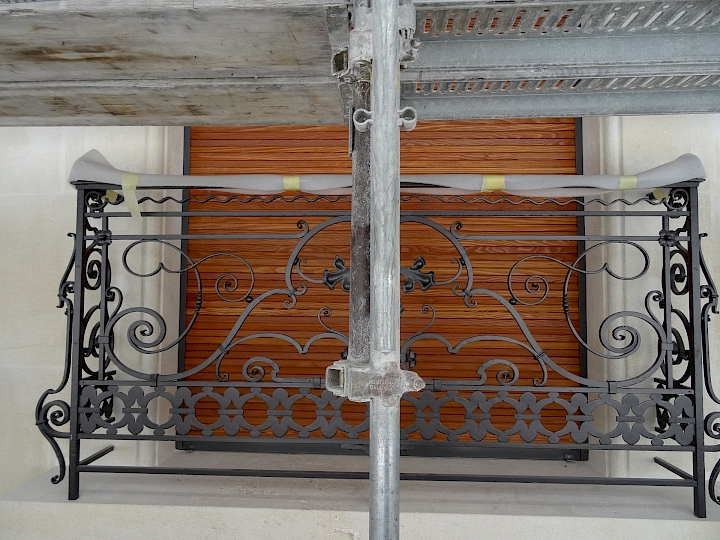 La totalité des garde-corps ont été déposés. Ils ont été sablés en atelier, afin d'ôter toutes traces de plomb et de corrosion. Après restauration et adaptation à 100cm, ils ont été peints. Teinte micasée ML-E7. Toutes les adaptations ont été réalisées sur le bas du garde-corps. De ce fait, notre intervention est très peu visible à l'oeil.