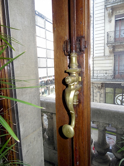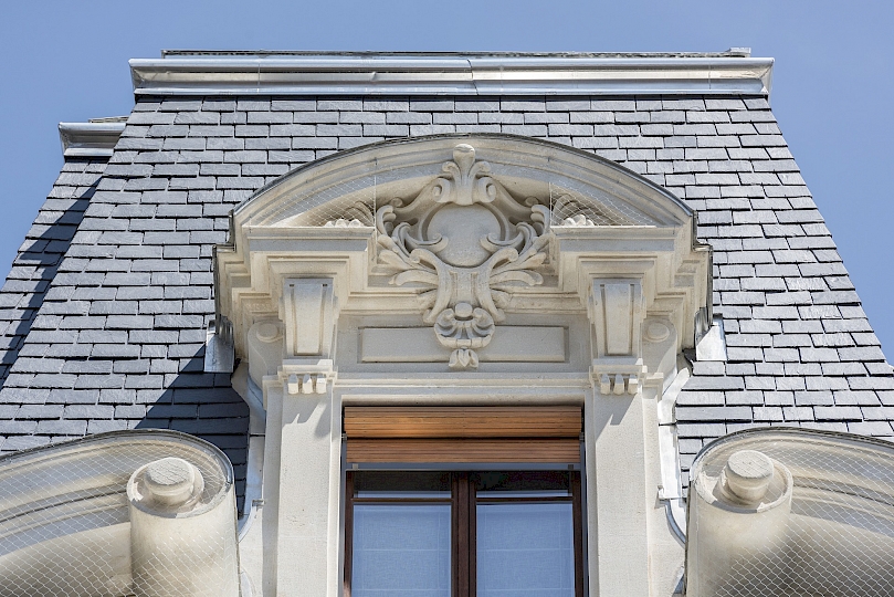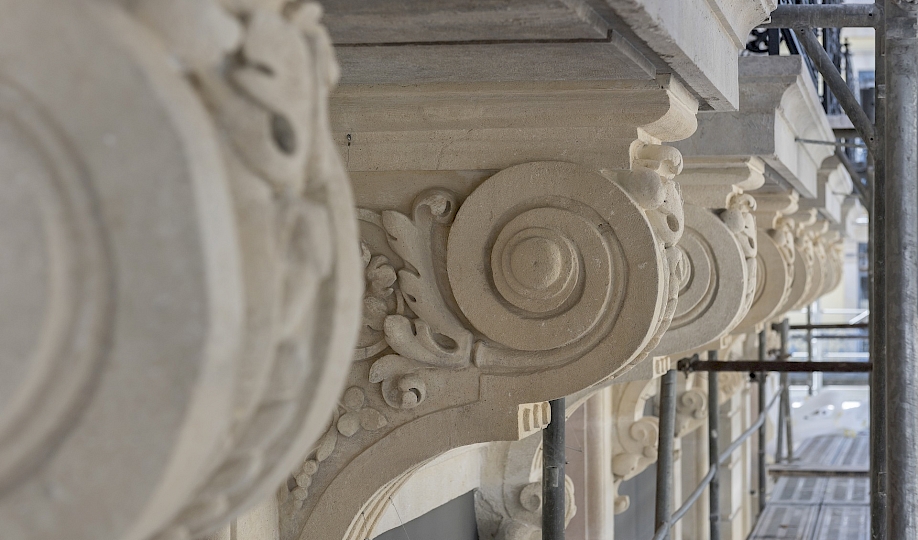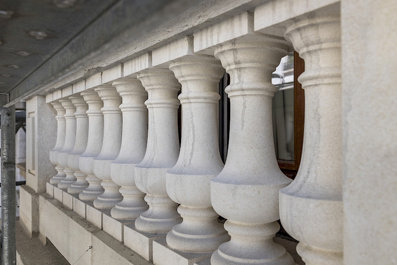 Les dalles de balcons ont été reprofilés. Les dalles de granit ont été sablées. Tous les joints ciment ont été curés et regarnis avec un mortier adéquat à base de chaux. Les balustres, trop endommagées, ont été remplacées. Les encadrements de fenêtres, les fonds de murs en pierre calcaire ont été lavés et ravalés.