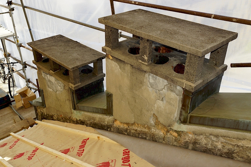 Les cheminées présentaient de nombreuses fissures. Les cadettes, mitres et chapeaux étaient endommagés. Une consolidation des fissures et un pontage de zones fragilisées avec un treillis ont été réalisés. Les crépis ont été refaits, de même qu'un surfaçage des cadettes et des gouttes pendantes. Le mortier du crépis est à base de chaux hydratée, chaux hydraulique et faible proportion de ciment. Il s'agit d'un crépis de la gamme Weber Marmoran. La teinte choisie est un gris, n°51122.