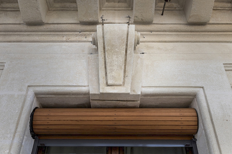 Les stores de l'immeuble étaient en métal, de couleur brun foncé ou clair, selon les derniers changements. Dans le cadre de la restauration de l'immeuble, nous avons opté pour des stores à tabliers en bois mélèze. Les lames sont en queue d'arronde de 9mm, finition Teck 085 (D5.51.29T). Les coulisses et lames finales sont thermolaquées NCS S 7000-N.