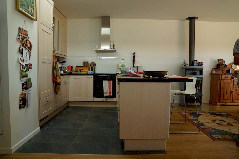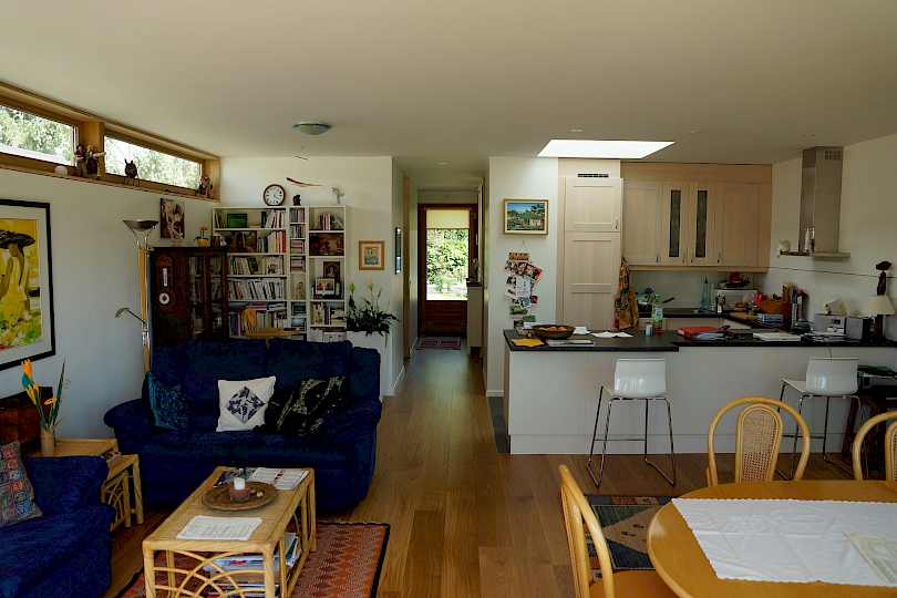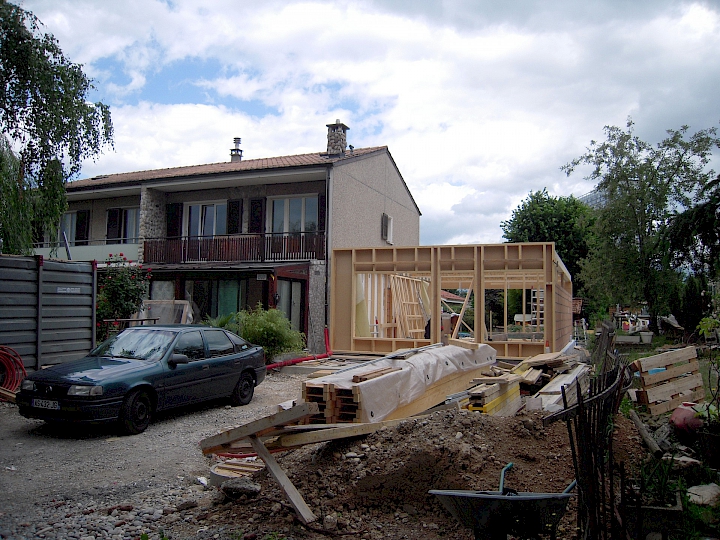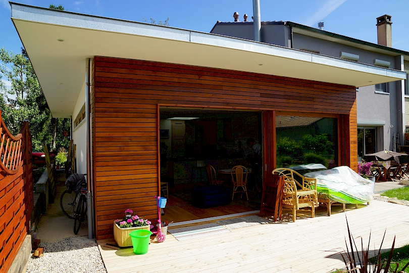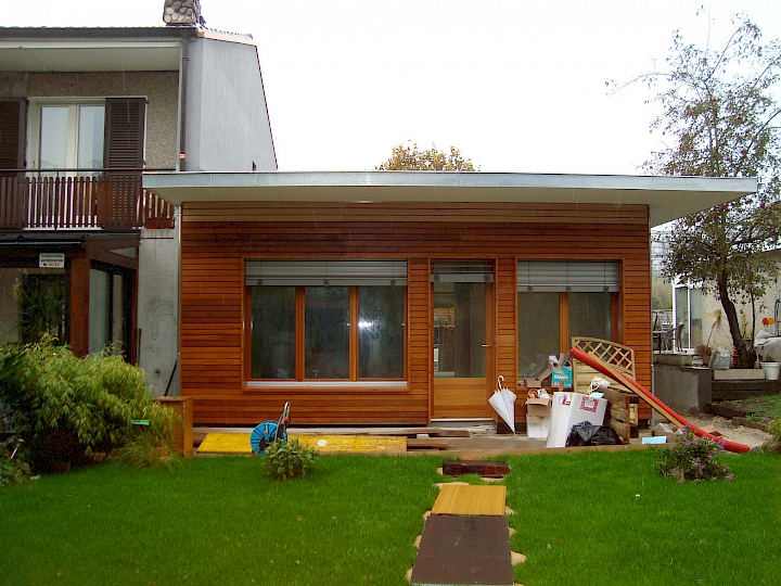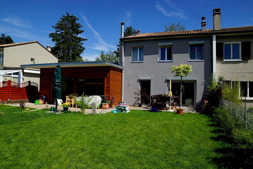 Cette maison a obtenu le label Minergie selon certificat n° GE-860. Le chauffage est assuré par une chaudière à gaz et un chauffage au sol en basse température. En complément à l’accumulateur existant pour la production d’eau chaude, des panneaux solaires thermiques et photovoltaïques recouvrent tout le pan de toiture sud-est de la maison existante. De plus, la maison est équipée d’une ventilation mécanique contrôlée avec récupérateur de chaleur. L’enveloppe est constituée d’un mur de refend en brique cellulaire, de deux façades pignons à ossature bois et bardage mélèze et, des fenêtres en mélèze avec verre isolants triples. Toute l’enveloppe, y compris la toiture, est isolée avec un épais matelas de laine de bois. Compte tenu des performances thermiques très élevées de l’enveloppe, le chauffage est assuré presque intégralement par un poêle en stéatite. Selon les occupants, le chauffage au gaz n’est utilisé que comme appoint, lors de grands froids.