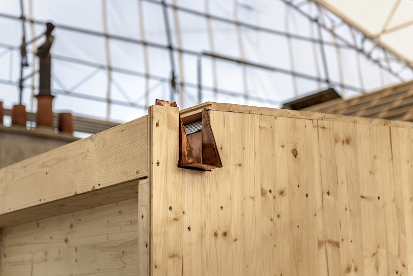 L'enveloppe thermique pour les locaux aménagés dans les combles a été conçue selon un standard de haute performance énergétique, avec des matériaux de grande qualité et répondant aux principes de mise en oeuvre dans les constructions anciennes (matériaux à haute diffusion de vapeur d'eau). Le dispositif de lucarnes est proposé selon des dimensions maximales autorisées par la nouvelle loi sur les lucarnes. En effet, la réflexion engagée sur cet édifice de 6 étages propose une "expérience pilote" afin de vérifier l'intégration au plan qualitatif et architectural d'une solution qui permettrait d'attenuer les effets négatifs induits par l'actuelle loi sur les lucarnes. Cette forme de lucarne permet d'obtenir une bonne intégration architecturale et incidemment offre la possibilité d'intégrer des panneaux solaires permettant de couvrir 30% des besoins en eau chaude sanitaire de tout l'immeuble conformément à la loi sur l'énergie. Ce concept permet également d'éviter de nombreux percements de la couverture en tuile pour les ouvertures diverses et multiples nécessaires pour éclairer les locaux et impliquant la pose de panneaux solaires en rive de toiture ou en dessous du faîte.