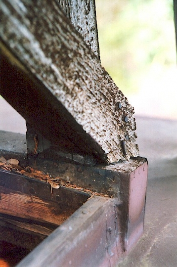 Vu de l'intérieur des combles, le voligeage jointif, sur lequel le lattage était cloué et les tuiles rapportées, était à première vue en moyen / bon état, ceci malgré la présence de traces d'infiltrations.