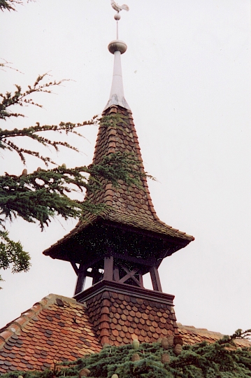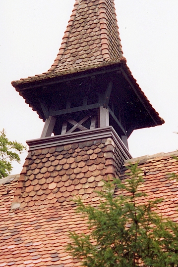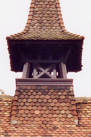 La hauteur entre le plancher du bahut, sous la cloche, et la rive de toiture faisait seulement 125 cm. C'est un plan carré, dont les côtés font 200 x 200 cm. On y trouvait un panachage de tuiles neuves et anciennes très contrasté sur la toiture de la nef. La charpente était en pin, bois de cœur riche en résine, et le placage en fer blanc et en tôles galvanisées.