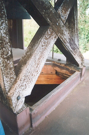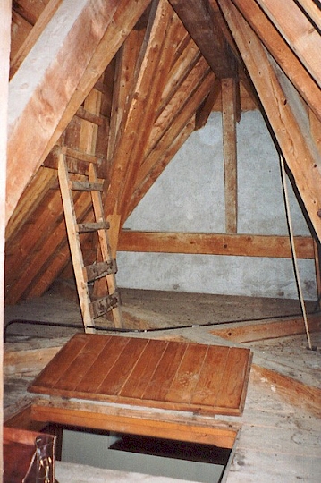 L'accès à la cloche était mal aisée: le passage se faisait par une trappe située juste au-dessus de l'orgue. Une fois dans les combles, une échelle en surplomb fixée à la soupente permettait d'atteindre un petit trappon de 40 x 45 cm débouchant sous la cloche. Cet accès était très difficile, même pour un individu svelte et agile.