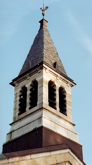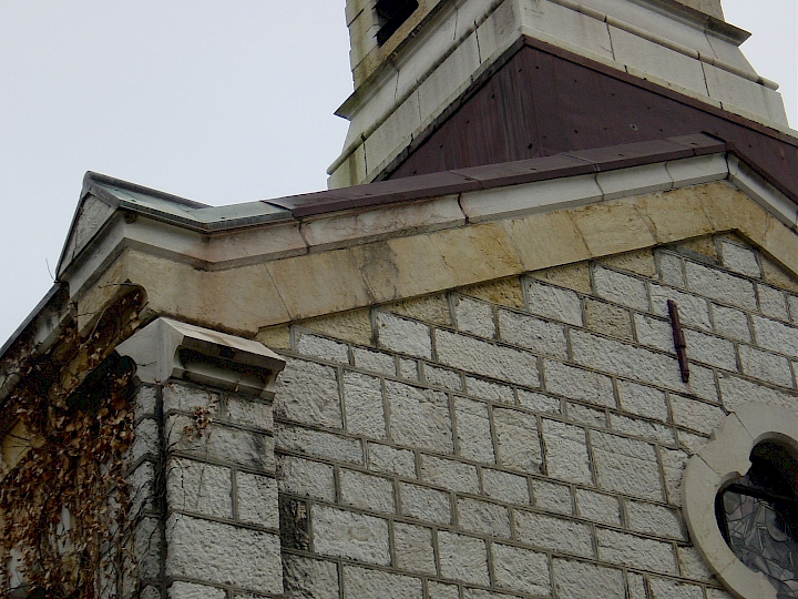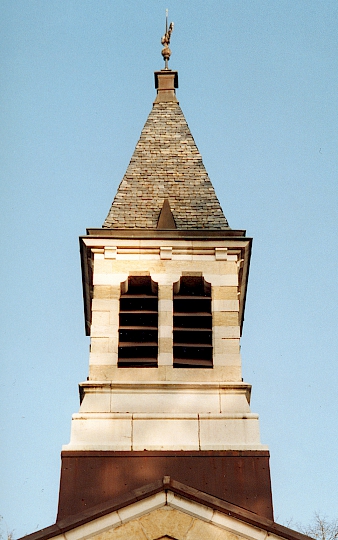 On remarque sur la première image, contrairement à la suivante, que la base du clocher n’était pas encore habillée d’un placage en tôle. La pierre était apparente, de même que sur les rampants de la façade principale et du porche d’entrée ainsi que les pierres triangulaires de la toiture du clocher.