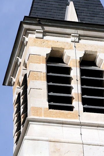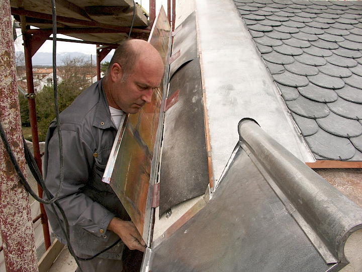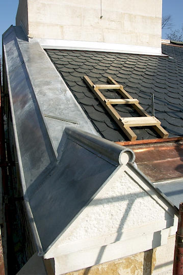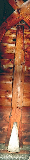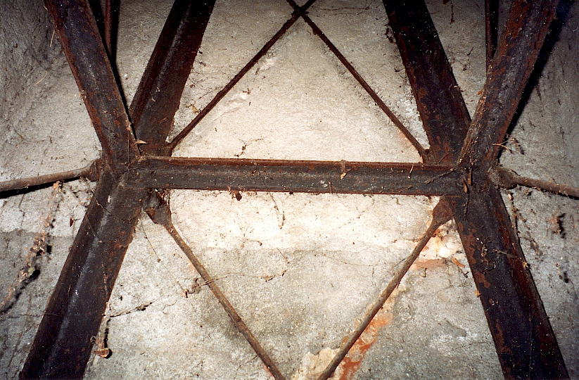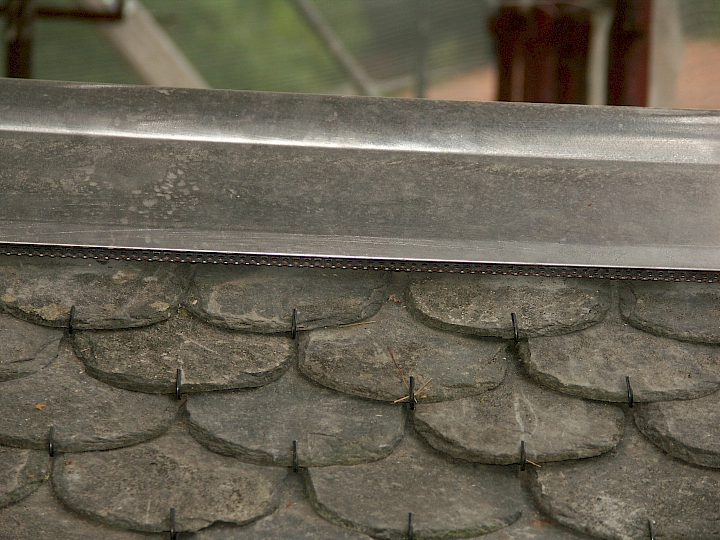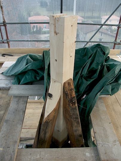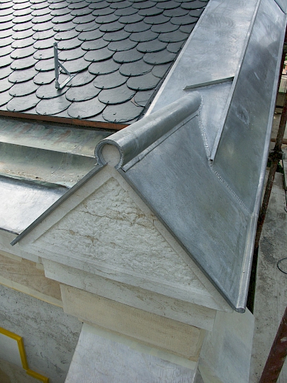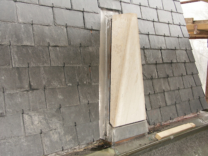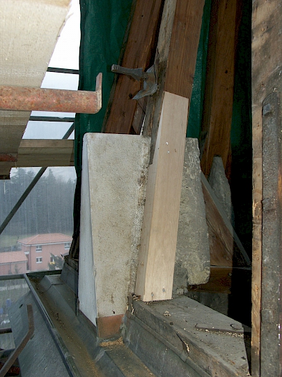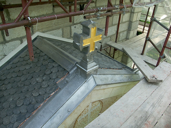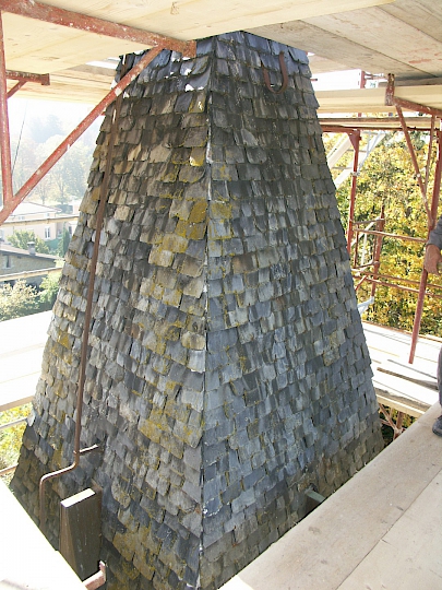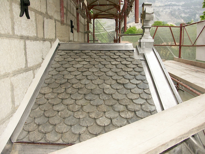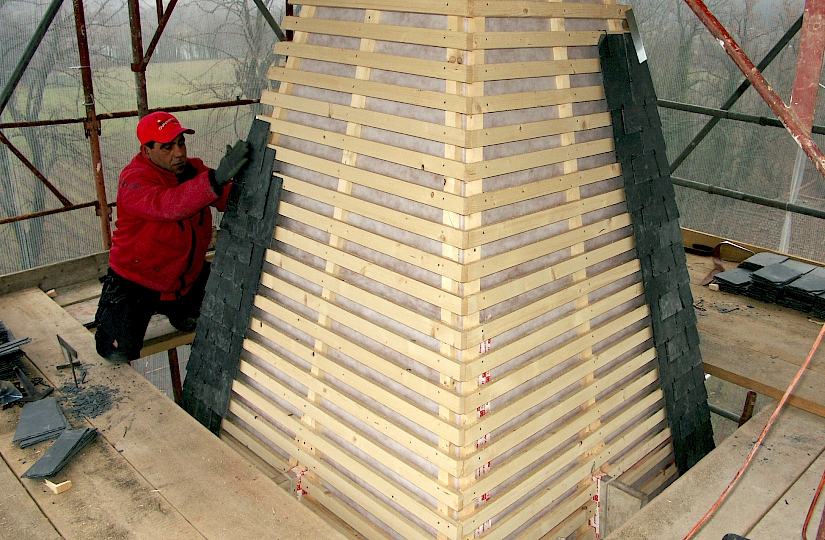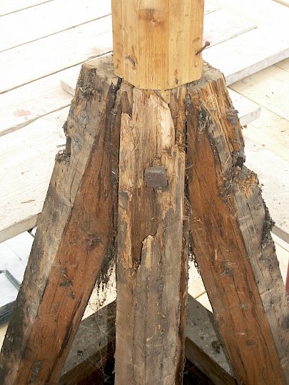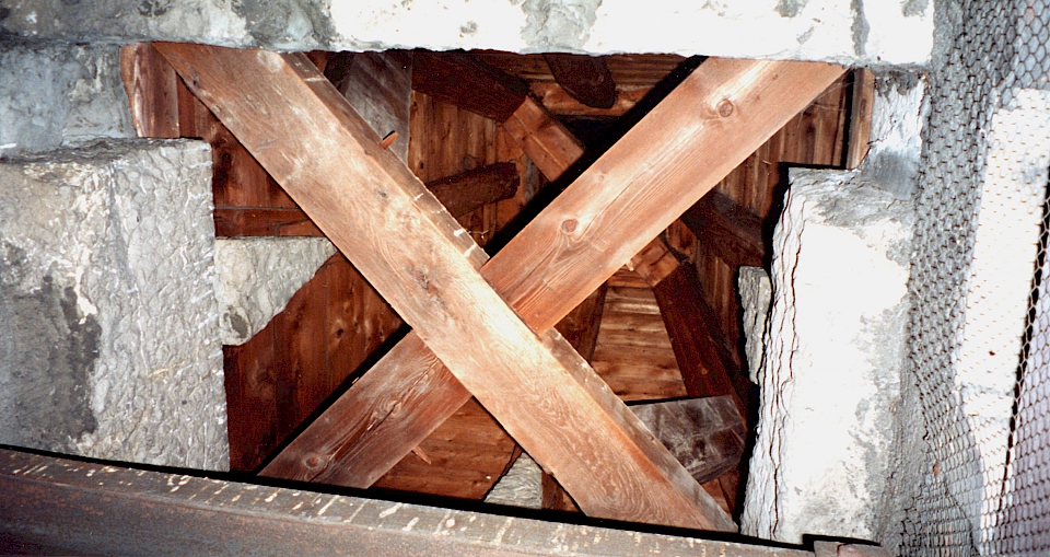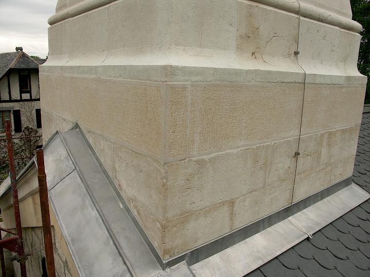 La toiture est constituée d’un voligeage jointif en relativement bon état jusqu’à la sablière. L’élément vertical sur lequel est fixé le voligeage, est un chevron-arbalétrier enfourché sur une pierre triangulaire. Cette pierre, présente sur les quatre pans de toiture, est enrobée de cuivre du côté extérieur.