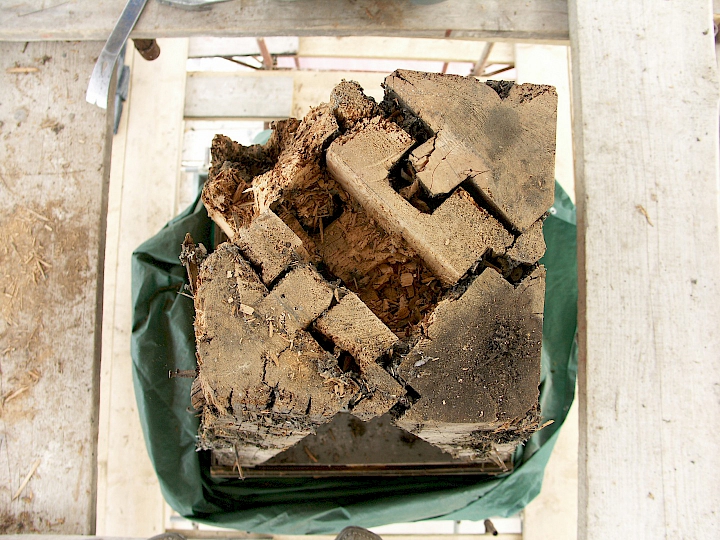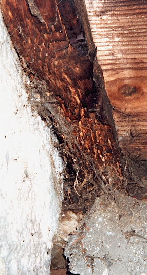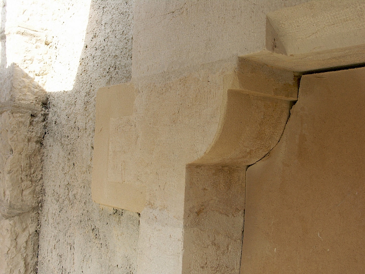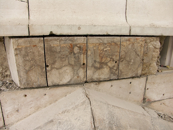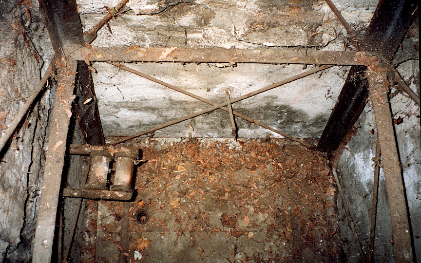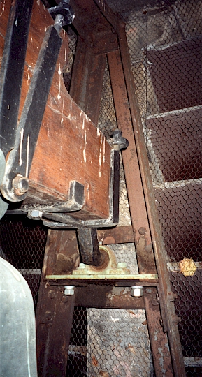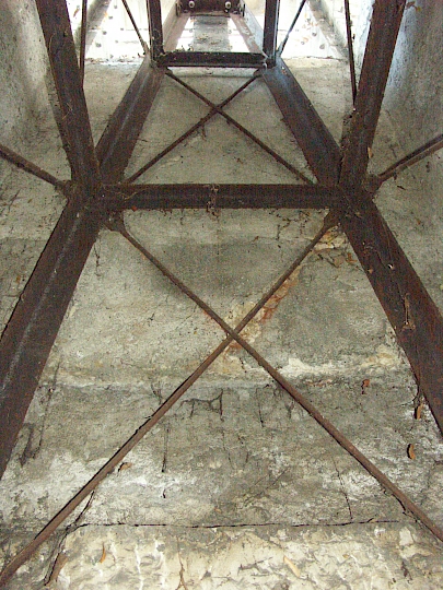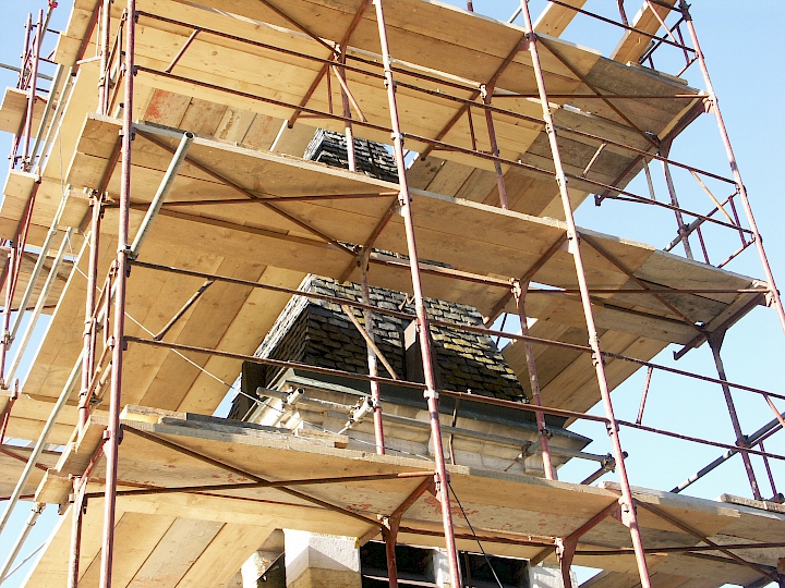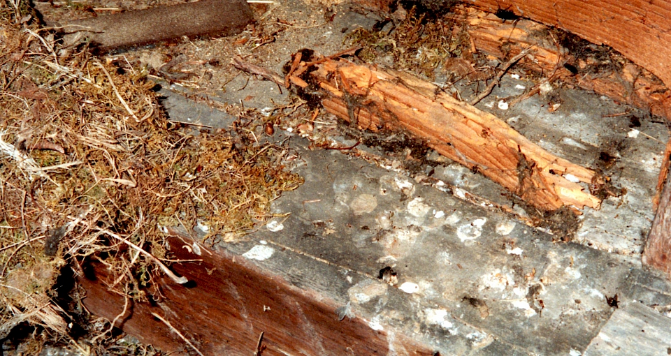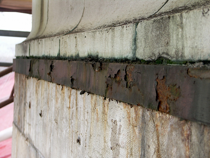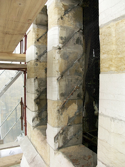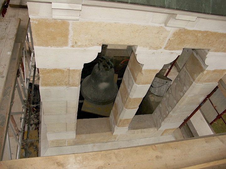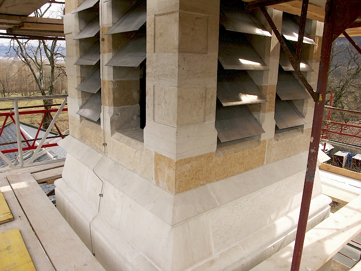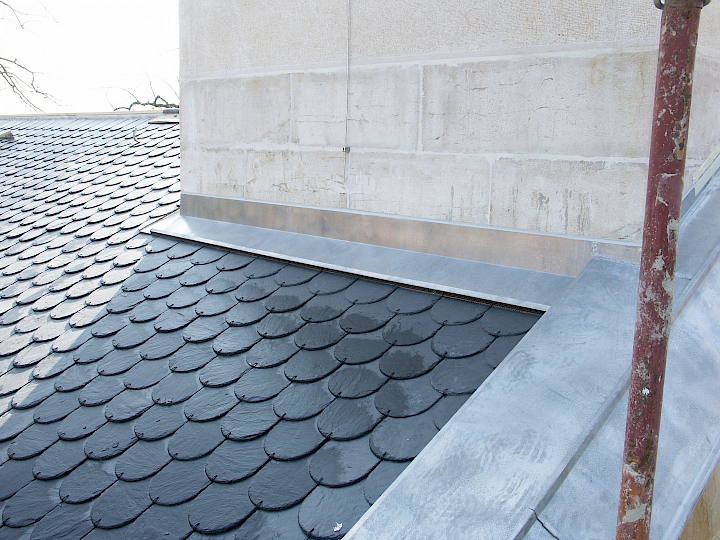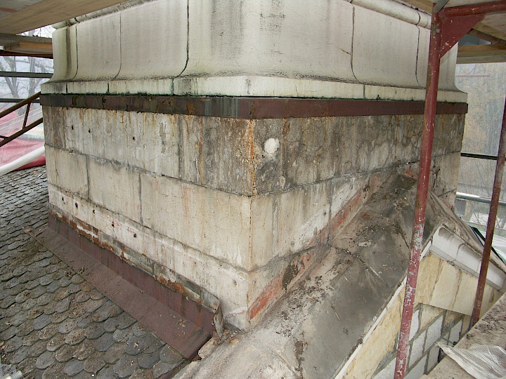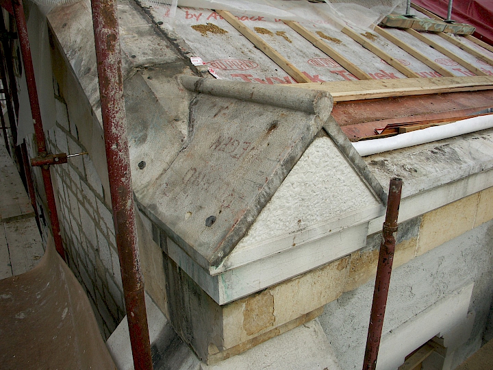 La toiture est constituée d’un voligeage jointif en relativement bon état jusqu’à la sablière. L’élément vertical sur lequel est fixé le voligeage, est un chevron-arbalétrier enfourché sur une pierre triangulaire. Cette pierre, présente sur les quatre pans de toiture, est enrobée de cuivre du côté extérieur.