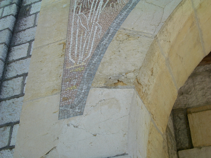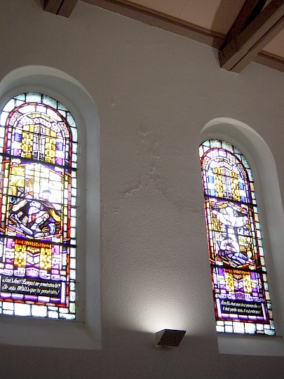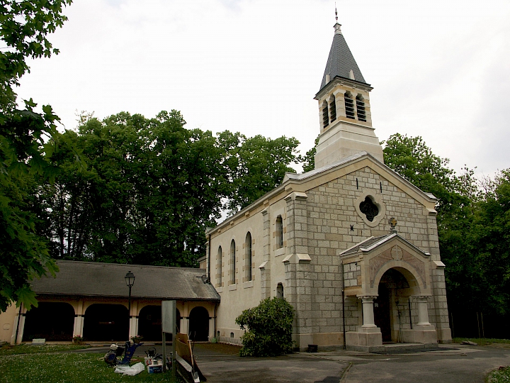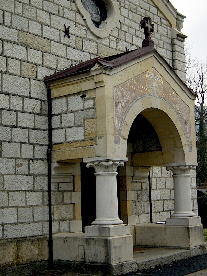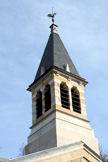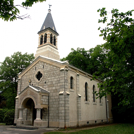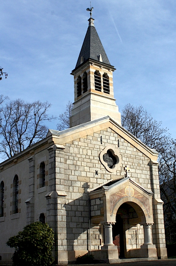 Temple Protestant au lieu-dit Le Bornalet construit en 1880-1881 par Charles Gampert sur l’initiative d’Antoine Martin. Construction néo-romane appareillée en calcaire, avec clocheton sur la façade et un porche établi sur de courtes colonnes, orné au fronton d’une mosaïque d’inspiration ravennate de Jacques Wasem. Vitraux du même artiste, 1950. Extrait de "Art et Monuments" - A. Brulhart & E. Deuber - Pauli.