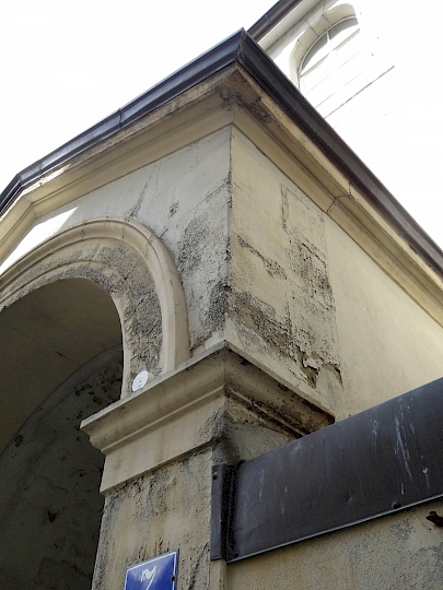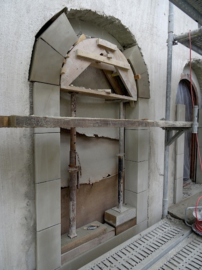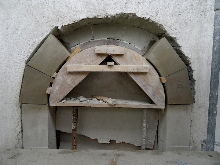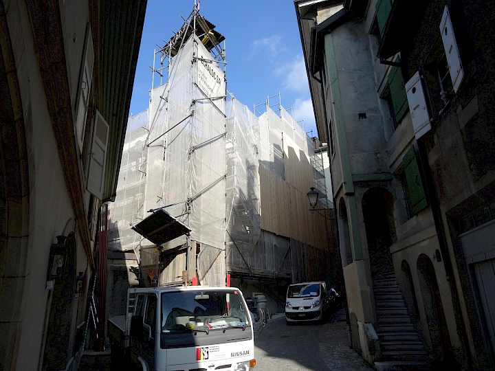 - Fin du XIXème siècle : première restauration par l’architecte Antony Krafft. Remplacements des colonnes inférieures en bois en colonnes de pierre provenant de Soleure (pour des raisons de statistique).