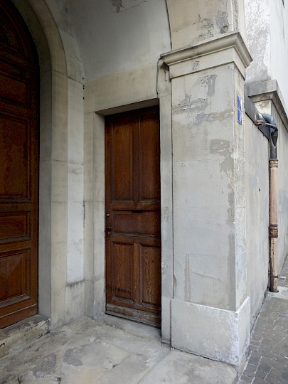 Le maillage particulièrement resserré, induit par le parcellaire médiéval, nous présente la façade principale de l’édifice perpendiculairement à la rue. Le manque de recul ne nous permet pas de voir la totalité de l’édifice.
