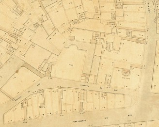 Le plan cadastral de Billon réalisé au début du XVIIIème siècle, met en évidence les limites du parcellaire. Nous distinguons déjà le parallélogramme qui forme la parcelle telle que nous la connaissons aujourd’hui. Cet espace est dévolu à une terrasse avec une construction en fond de cour, un petit jardin à l’extrémité gauche. Un siècle plus tard, le plan Céard remis à jour, montre l’Église dans ses proportions actuelles. Ce plan nous fournit plus de précisions sur les passages, notamment les cages d’escaliers colorées en rouge. On distingue un escalier balancé sur la gauche et un escalier droit sur la droite.