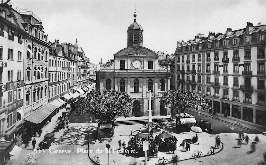 La grosse cloche, coulée par Jean Du Villard en 1607, se trouvait à l'origine dans tour de l'horloge du Molard et fut transférée à la Fusterie en 1763. Son diamètre est de 111 cm. En arrière plan, on distingue la cloche moyenne, coulée par les frères Michel et Alexis Joly & Etienne de la Paix en 1678. Elle provient peut-être de l'arsenal. Son diamètre est de 55 cm. Sur la vue 38, on distingue en arrière plan, la petite cloche coulée en 1699, son auteur n'est pas identifié, selon l'inventaire de A. Cahorn, il s'agit peut-être de Jean Revillard. Son diamètre est de 46 cm. Ces trois cloches ont simplement été brossées à l'eau afin de ne pas endommager la surface.
