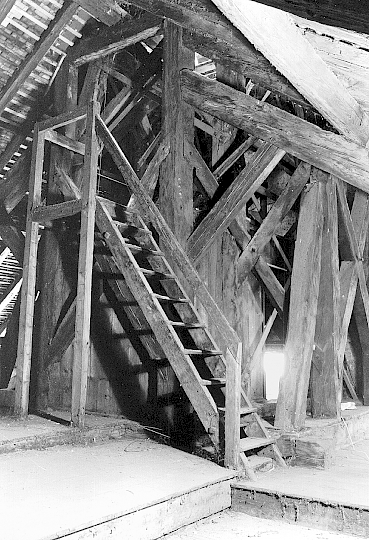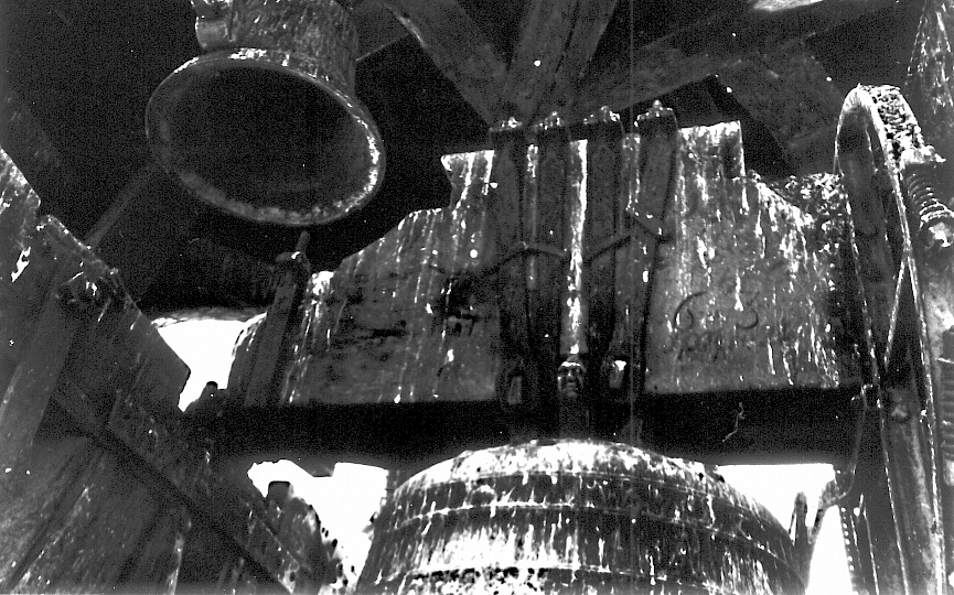 Vue plongeante sur le joug et la grosse cloche avant et après les travaux.