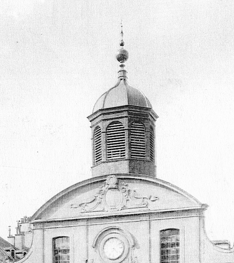 Vue générale de la façade principale et du clocher, après la pose des nouveaux abat-son, début janvier 2002. Les abat-son ont été conçus en "red cedar "cèdre rouge, Grâce à sa teneur élevée en huile naturelle, cette essence est particulièrement adaptée aux situations de grandes expositions aux intempéries et au rayonnement ulta-violet. Ce bois à la caractéristique d'être très homogène et sans nœud. Sa teinte naturellement rouge s'harmonise avec le revêtement en écaille de zinc couleur tuile.