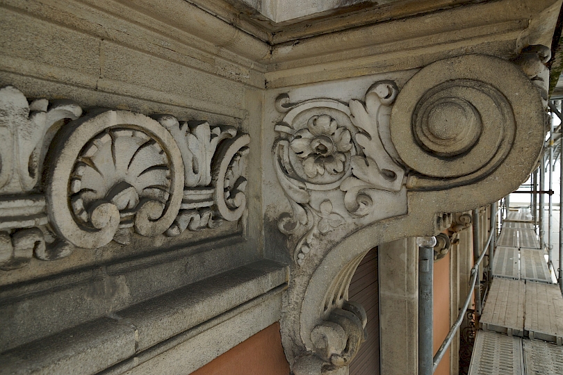 Les ornements ont été retaillés, leurs courbes reprofilées. Ce traitement, réalisé par un sculpteur, a permis d'ôter toutes traces de salissure et d'érosion. Le médaillon a retrouvé son aspect d'origine.