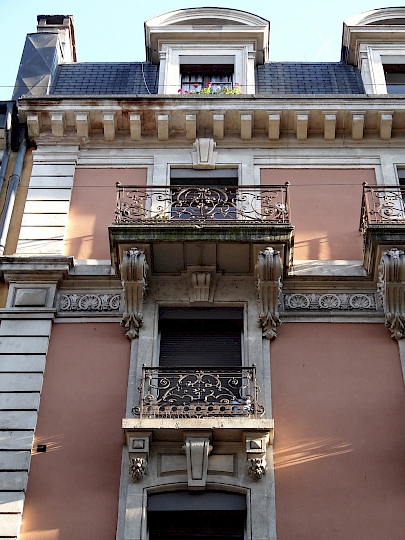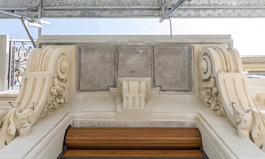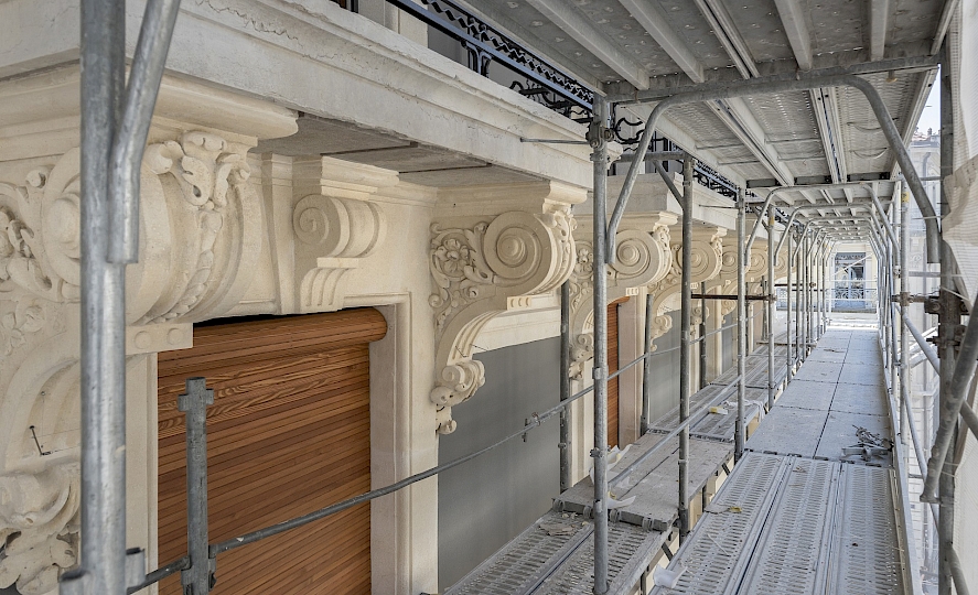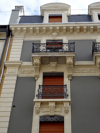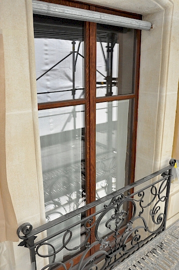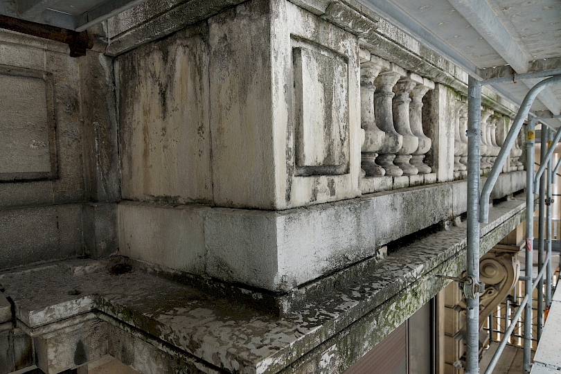 Les dalles de balcons ont été reprofilés. Les dalles de granit ont été sablées. Tous les joints ciment ont été curés et regarnis avec un mortier adéquat à base de chaux. Les balustres, trop endommagées, ont été remplacées. Les encadrements de fenêtres, les fonds de murs en pierre calcaire ont été lavés et ravalés.