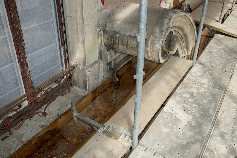 La ferblanterie en cuivre, oxydée, a été remplacée par du cuivre étamé. Tous les raccords avec la pierre ont été optimisés. Nous avons réalisé des césures dans la pierre afin d'insérer les ferblanteries. Après fixation du cuivre étamé, le tailleur a fermé les césures avec un joint à base de mortier de chaux adapté avec un concassé de pierre. Cette finition permet un détail plus abouti et une meilleure étanchéité. Le chéneau, marqué par de nombreuses infiltrations, a été redessiné afin que les eaux de pluie s'écoulent plus rapidement. Les anciens panneaux en aggloméré ont été remplacés par des panneaux 3 plis phénolés.