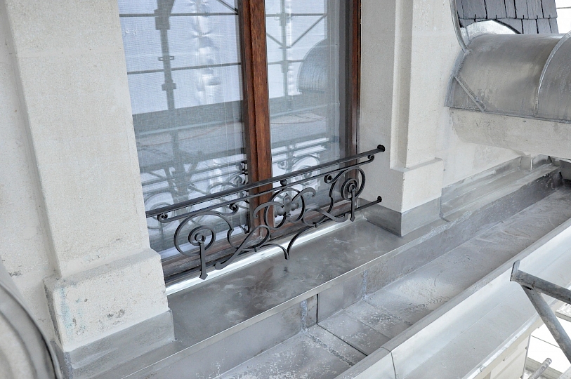 La totalité des garde-corps ont été déposés. Ils ont été sablés en atelier, afin d'ôter toutes traces de plomb et de corrosion. Après restauration et adaptation à 100cm, ils ont été peints. Teinte micasée ML-E7. Toutes les adaptations ont été réalisées sur le bas du garde-corps. De ce fait, notre intervention est très peu visible à l'oeil.