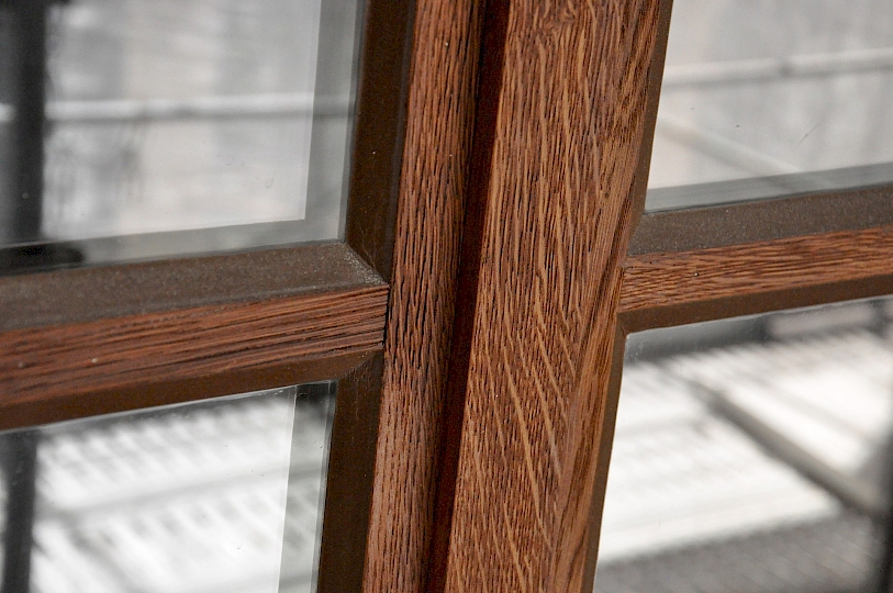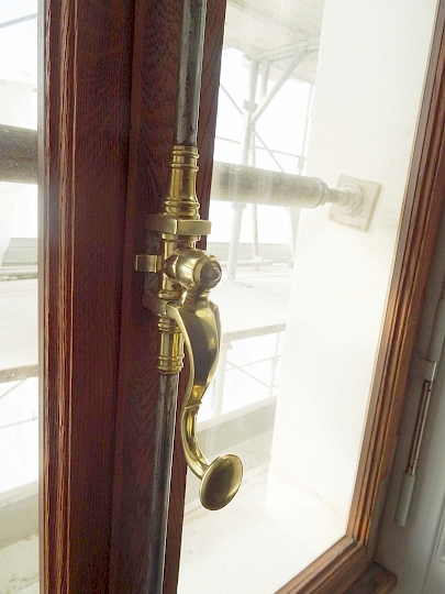 Les fenêtres existantes, à simple vitrage, ont la peinture écaillée, laissant le bois exposé aux intempéries. Les mastics ne sont plus étanches. Les vantaux ont été déposés et traités en atelier afin d'éliminer le plomb et l'amiante. Les cadres extérieurs ont été rabotés et huilés. Les vantaux ont été adaptés avec une recharge en chêne, élargissant la feuillure et permettant la mise en place d'un double vitrage composé d'un verre isolant float de 4mm + intercalaire thermique 10mm au gaz Krypton + verre low-E Lux de 4mm. Intercalaire thermolaqué RAL 8007, coupe à l'onglet. Traitement vantaux et cadre extérieur.: huile lasure de chez Galtane, teinte 7012 Chêne. Pose d'un solin en silicone à 45° Gyso-Unisilicon 707, teinte Brun. Les contre-coeurs ont été doublés et isolés par l'intérieur. Réfection des joints entre les cadres de fenêtres et la pierre de taille avec un silicone Gyso-Sil S-70, teinte Jasmin. Les espagnolettes et tous les ferrements ont été sablés, polis et traités avec une huile durcissante avant repose.