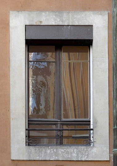 Les lambrequins existants étaient droits, brun foncé. Nous les avons remplacés par des lambrequins de forme identique à l'existant (droit ou arrondi), thermolaqués NCS S 7000-N, la même teinte que les coulisses et lames finales de stores. Nous avons ajouté des décors, dont la forme en fleur de lys provient d'un dessin présent sur les garde-corps.
