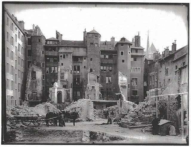 Au tournant du XIXème siècle, la construction de nouveaux ensembles immobiliers voient le jour avec les percements de rues. Deux cabinets d'architectes se chargent des démolitions et de la reconstruction des rues: les architectes J. Tedeschi à la rue du Prince, J. Grosset et A. Golay à la Tour-Maîtresse.