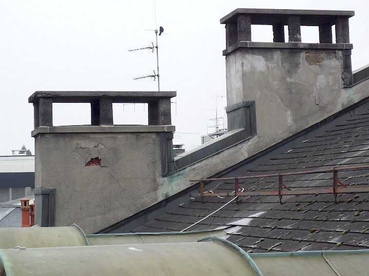 Les cheminées présentaient de nombreuses fissures. Les cadettes, mitres et chapeaux étaient endommagés. Une consolidation des fissures et un pontage de zones fragilisées avec un treillis ont été réalisés. Les crépis ont été refaits, de même qu'un surfaçage des cadettes et des gouttes pendantes. Le mortier du crépis est à base de chaux hydratée, chaux hydraulique et faible proportion de ciment. Il s'agit d'un crépis de la gamme Weber Marmoran. La teinte choisie est un gris, n°51122.